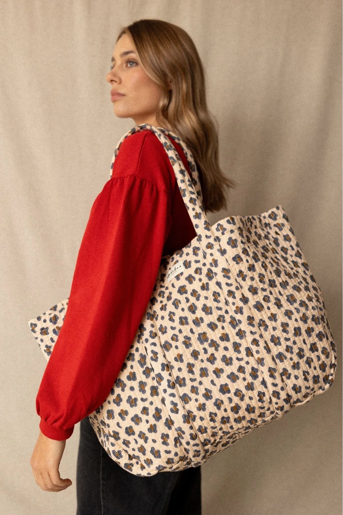 Le cabas SAHA se pare d’un imprimé léopard audacieux qui apporte caractère et style. Son grand format en coton matelassé permet de transporter tous vos essentiels avec aisance, que ce soit pour le marché, la plage ou les sorties en famille. Pratique et tendance, il devient un indispensable au quotidien.