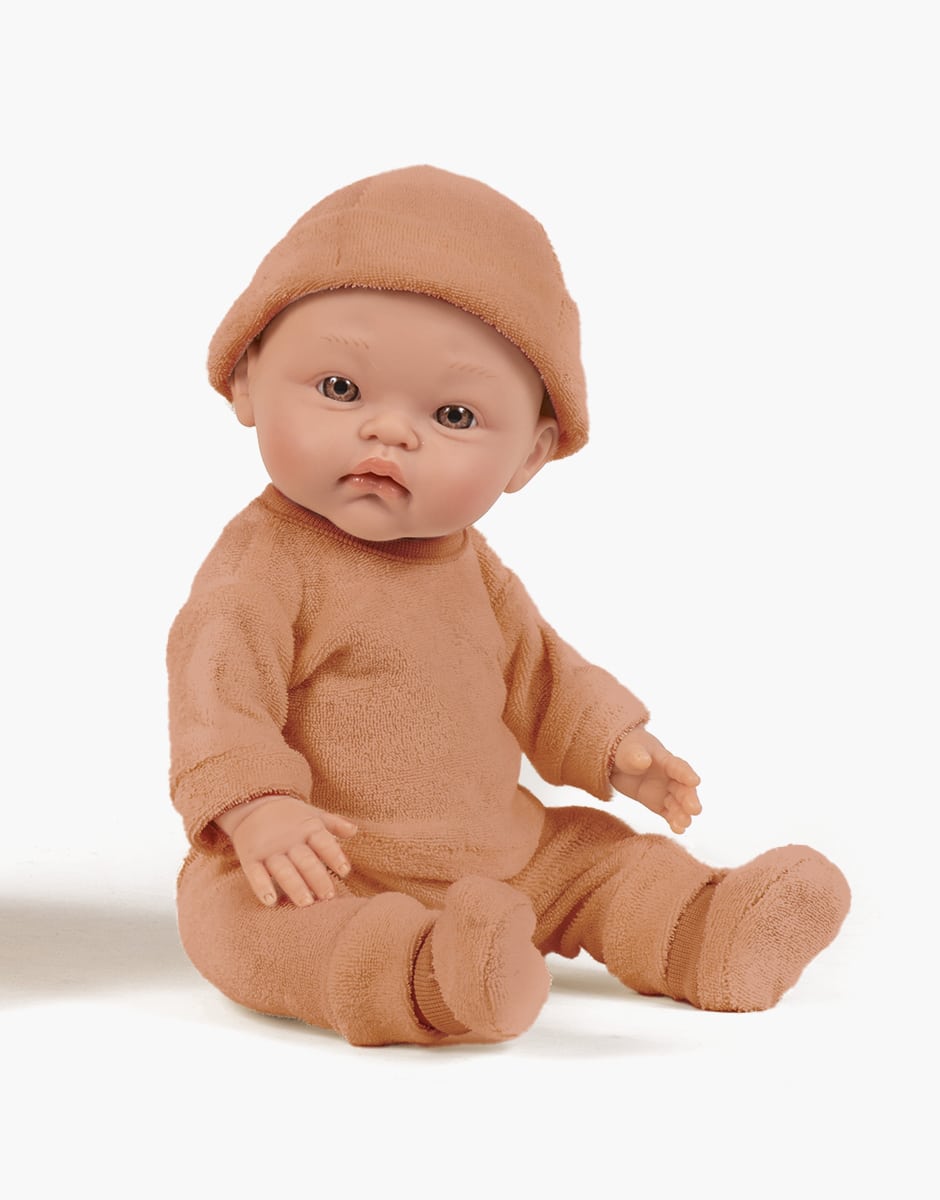 Octave, poupon asexué Minikane 36cm aux yeux marrons. Octave est habillé avec son Dors bien en molleton éponge et son bonnet Tico.