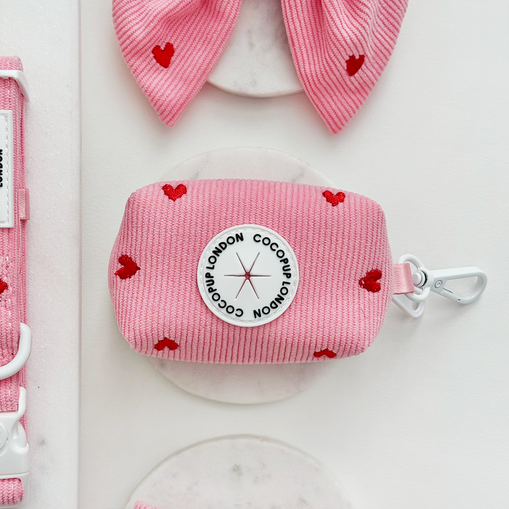 Gardez vos sacs à crottes à portée de main et vos promenades stylées avec le Porte-Sac à Crottes Cordon Cœurs Roses. Fabriqué en matériau cordon rose bébé avec de jolis cœurs rouges brodés, cet accessoire ludique vous assure de ne jamais oublier l'essentiel tout en ajoutant une touche douce à votre promenade avec votre chien.