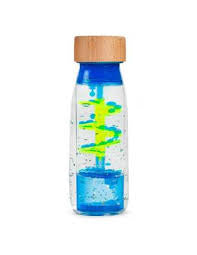 Cette bouteille éveille la curiosité inhérente à tous les enfants pour le monde qui les entoure. Grâce à sa spirale au centre, on observe le liquide bleu faire des petites gouttes et tourner autour de la spirale centrale. C'est vraiment apaisant pour les petits comme les grands.