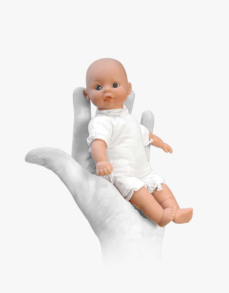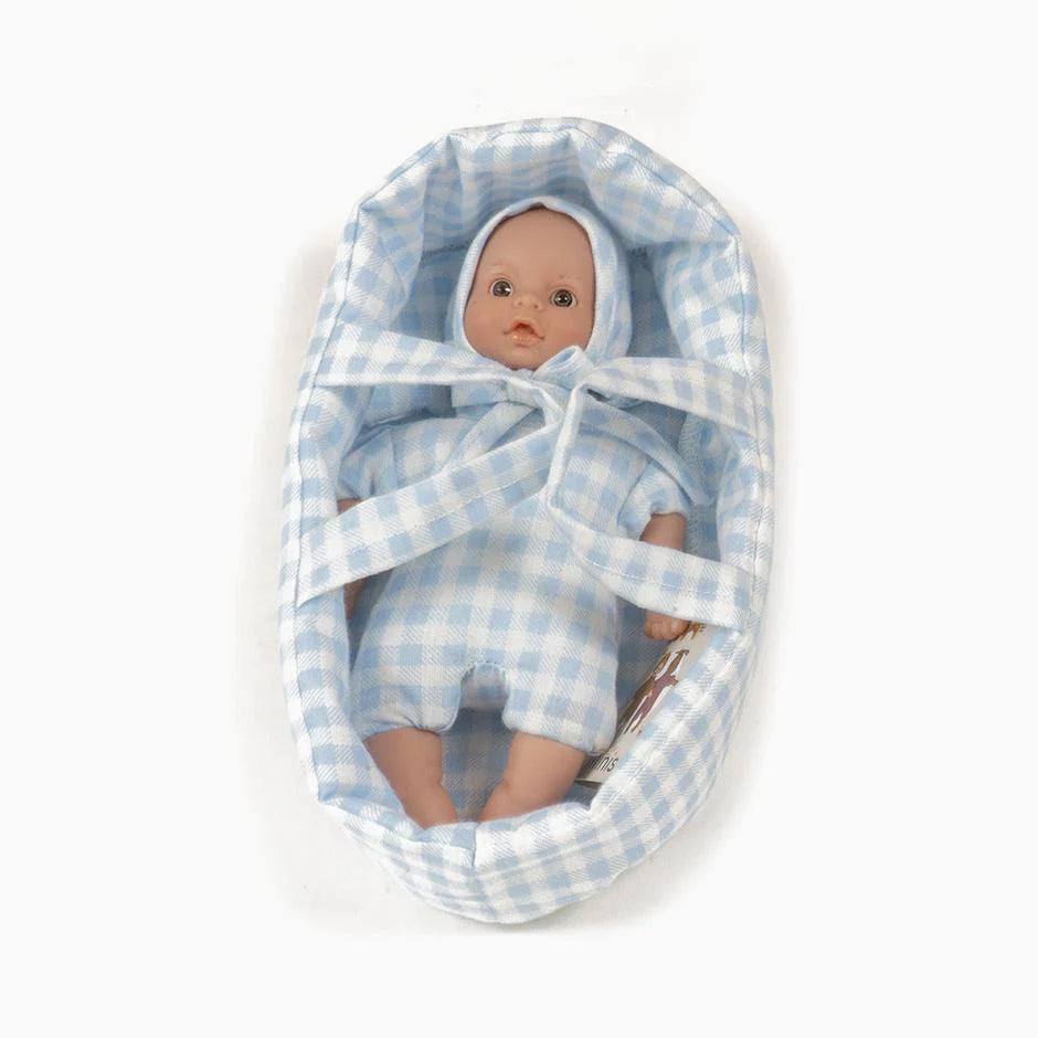 L’ensemble comprend un Mini poupon et son béguin noué et un couffin avec oreiller.